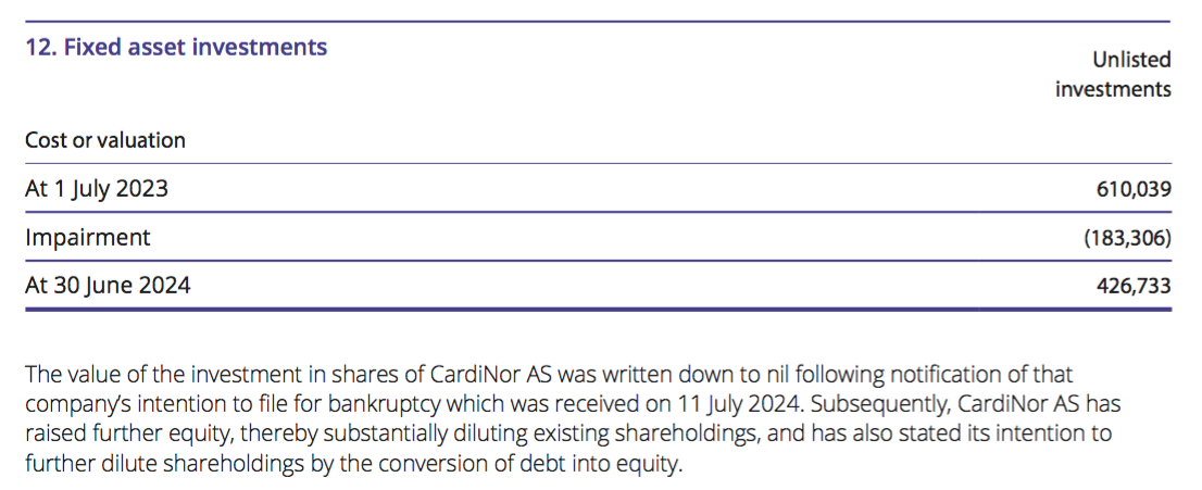“An impairment provision against the value of the investment in shares of CardiNor AS has been made in the year ended 30 June 2024, following notification of that company’s intention to file for bankruptcy received on 11 July 2024. Subsequently, CardiNor AS has raised further equity, thereby substantially diluting existing shareholdings, and has also stated its intention to further dilute shareholdings by the conversion of debt into equity. The impairment charge is shown in the Statement of comprehensive income and the carrying value of investments in note 12 to the financial statements. The carrying value of the remaining investment will continue to be historic cost.”