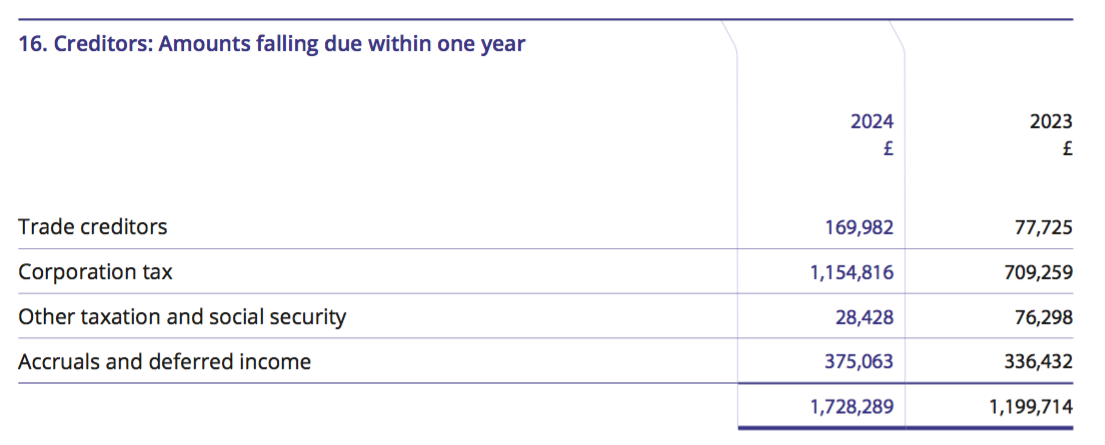 Total creditors are equivalent to 13% of revenue, and the proportion has bobbed between 3% and 15% during the last decade. Creditors are mostly tax, accrued expenses and deferred income (advance customer payments), with trade creditors at £170k probably about right given non-staff costs were £1.55m.