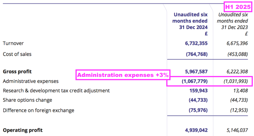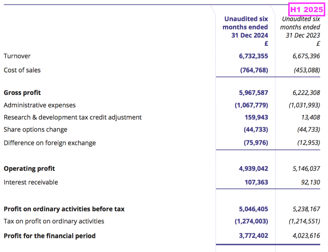 - Reported revenue for this H1 gained just 1% to £6.7m to set a new H1 record: