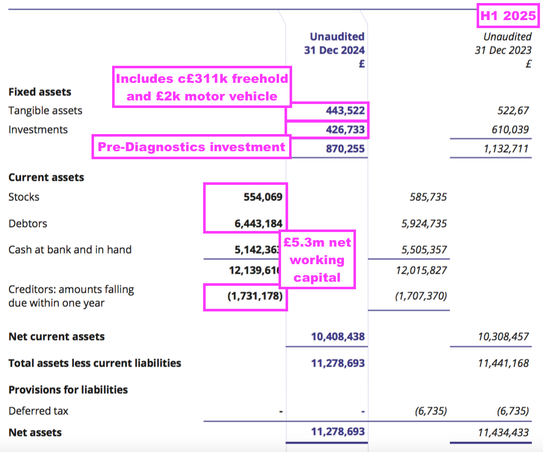 - Net assets of £11.3m less cash of £5.1m leaves £6.1m, represented by debtors (£6.4m), stock (£0.6m), tangible assets (£0.4m) (which include a company car for visiting the sheep (point 6a)), the Pre-Diagnostics investment (£0.4m) and creditors (£1.7m):