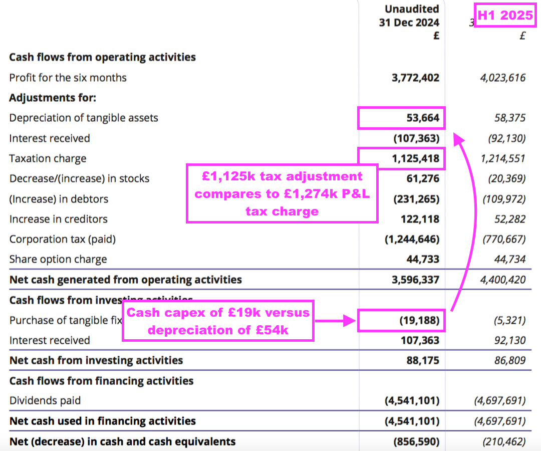 - The aforementioned £19k H1 capex compares to H1 depreciation of £54k, and both figures were tiny versus H1 earnings of £3.8m:
