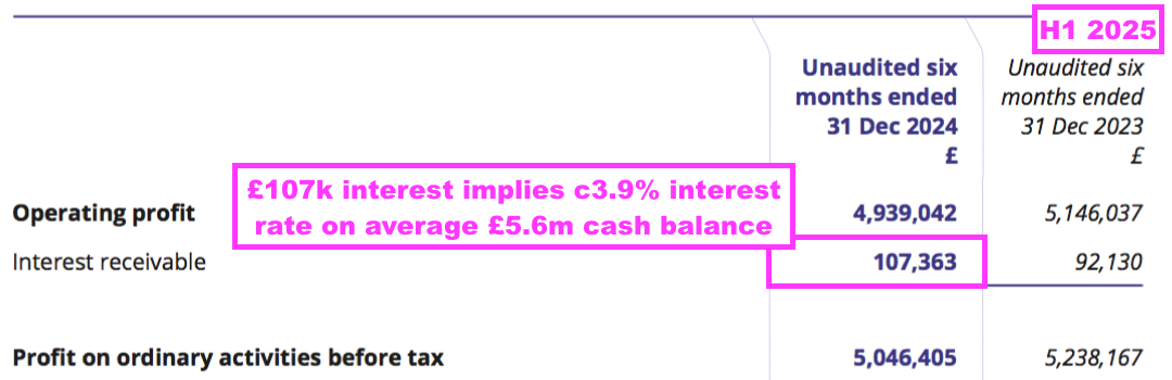 - Bank interest earned during this H1 came to £107k, implying a useful c3.9% interest rate on the average £5.6m H1 cash balance: