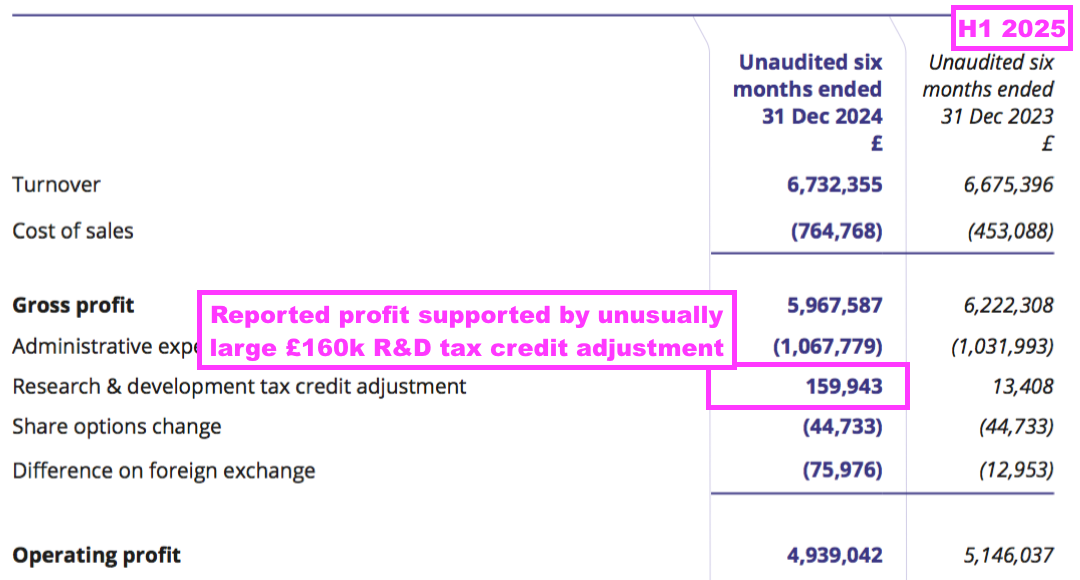 - Reported profit was boosted by an unusually large and unexplained £160k R&D tax credit adjustment: