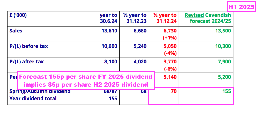 - After the preceding H2 dividend was reduced by 3p to 87p per share, this H1 seemed likely to me to declare an unchanged H1 payout.