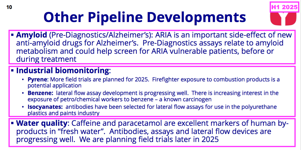 - With neither the secondary application for troponin nor the biomonitoring projects attracting much commercial interest, future growth now seems dependent entirely on the Alzheimer’s R&D — revenue from which “increased” during this H1.