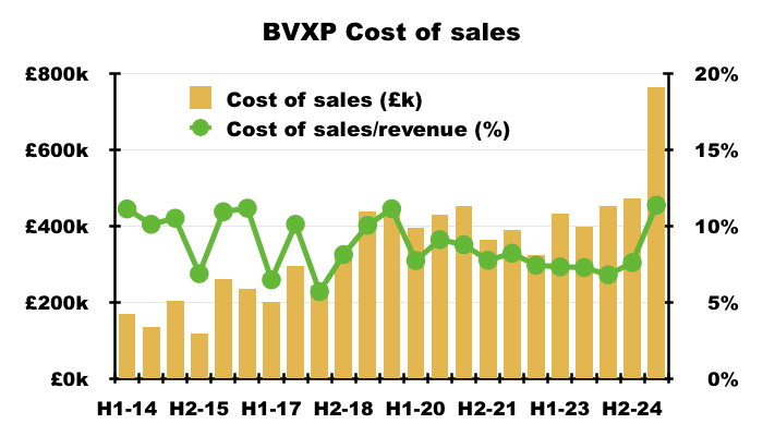 - Dividend cover falling below 1x arguably means BVXP is funding its greater cost of sales (i.e. greater external R&D) by dipping into its cash position (see Financials: balance sheet and cash flow). This H1 confirmed: