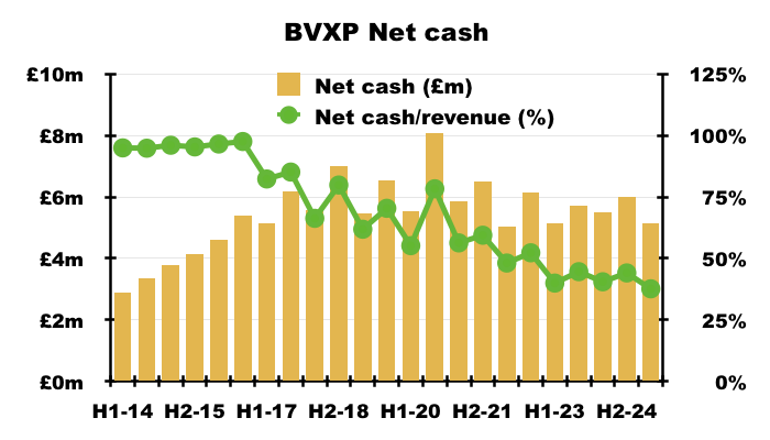 - H1 cash of £5.1m is equivalent to 38% of trailing twelve-month revenue, which is reassuringly high compared to most quoted companies but relatively low for BVXP.