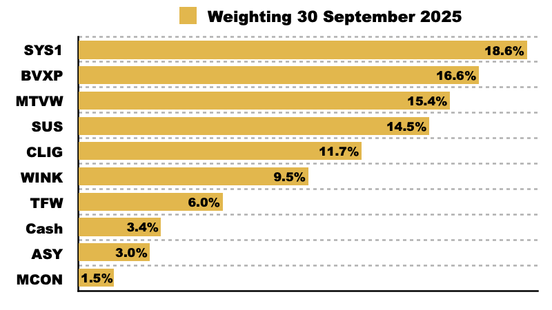 And this chart confirms my portfolio’s holdings and their weightings at the end of Q3 2025: