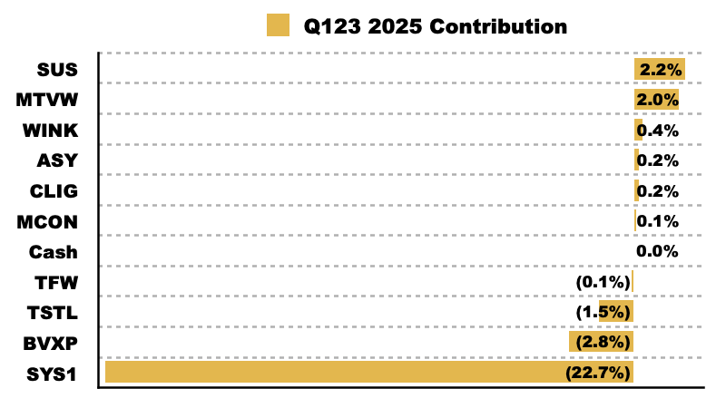 This chart shows each holding’s contribution towards my 21.9% nine-month loss:
