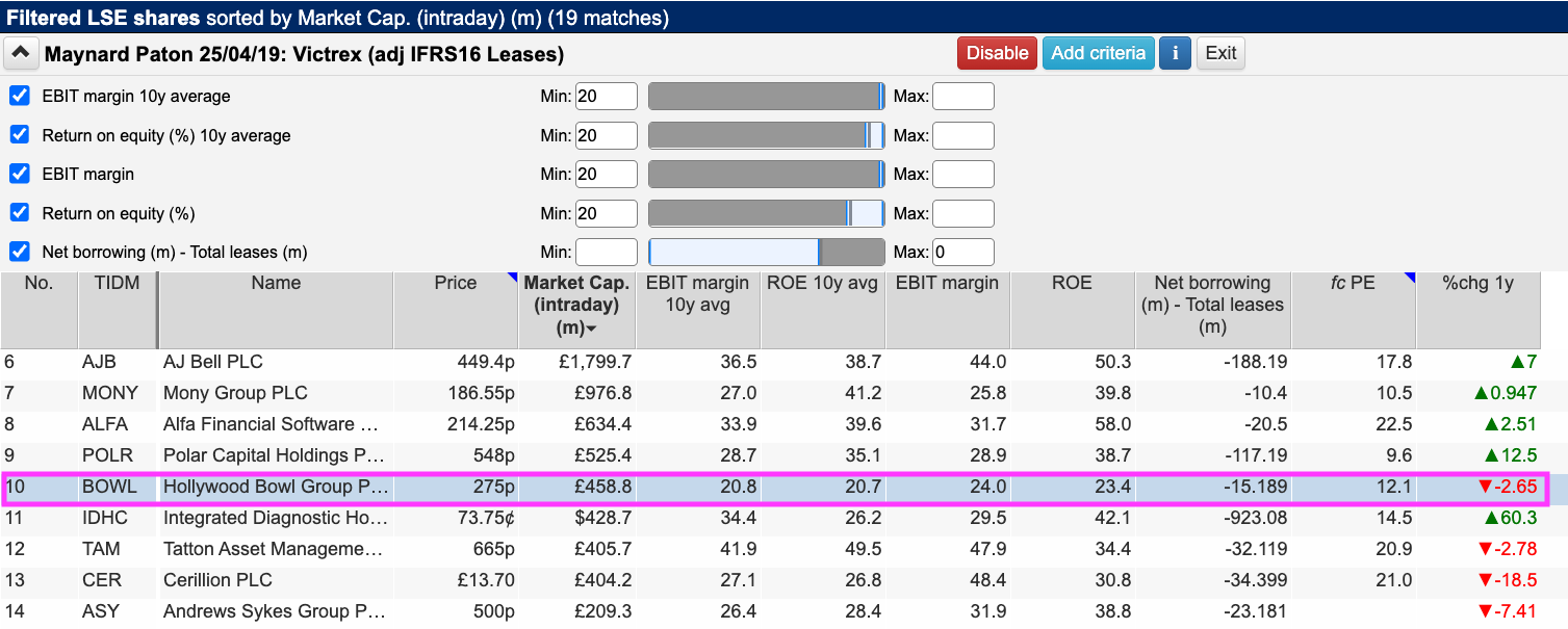 This time the filter returned 19 matches, including Games Workshop, IG Group, Rightmove, Plus500, Polar Capital, Cerillion, Tatton Asset Management, Record and Jarvis Securities.
