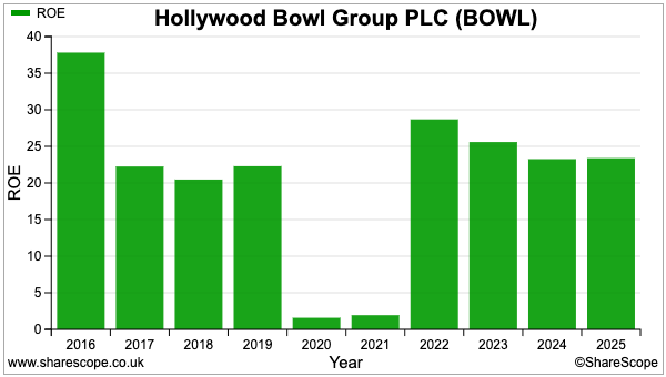 But sure enough, ShareScope shows Hollywood Bowl reporting an average 21% margin and average 21% ROE since 2016 — despite the group suffering badly during the pandemic: