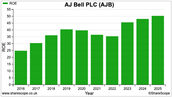 This time I selected AJ Bell, primarily because I have been a customer of the investing platform for 25 years. ShareScope also shows AJ Bell registering a wonderful 40%-plus margin and ROE since 2023: